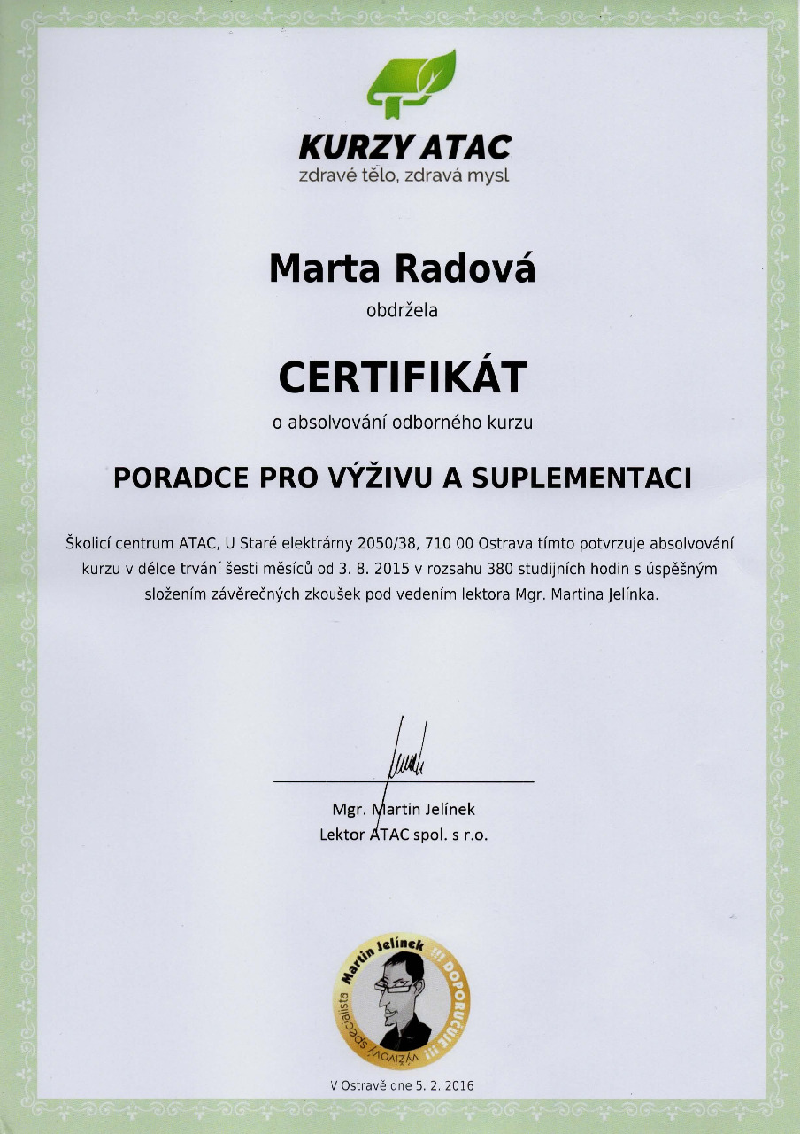 Před několika lety jsem se rozhodla zdravě stravovat a zbavit se nadbytečného tuku . Došlo také k snížení hodnot cholesterolu a krevního cukru. Tato zkušenost mě motivovala ke vzdělávání v tomto oboru a nabízet pomoc druhým.